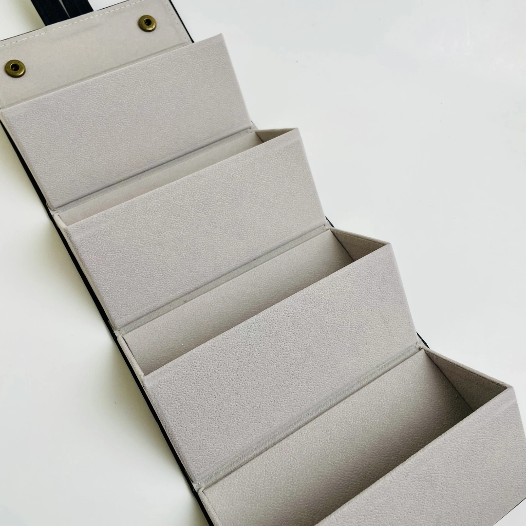 "Streamline your eyewear collection with our 4-in-1 folding organizer. Designed to securely hold four pairs of glasses in a single, compact unit, it’s the ultimate space-saver for your home or suitcase.