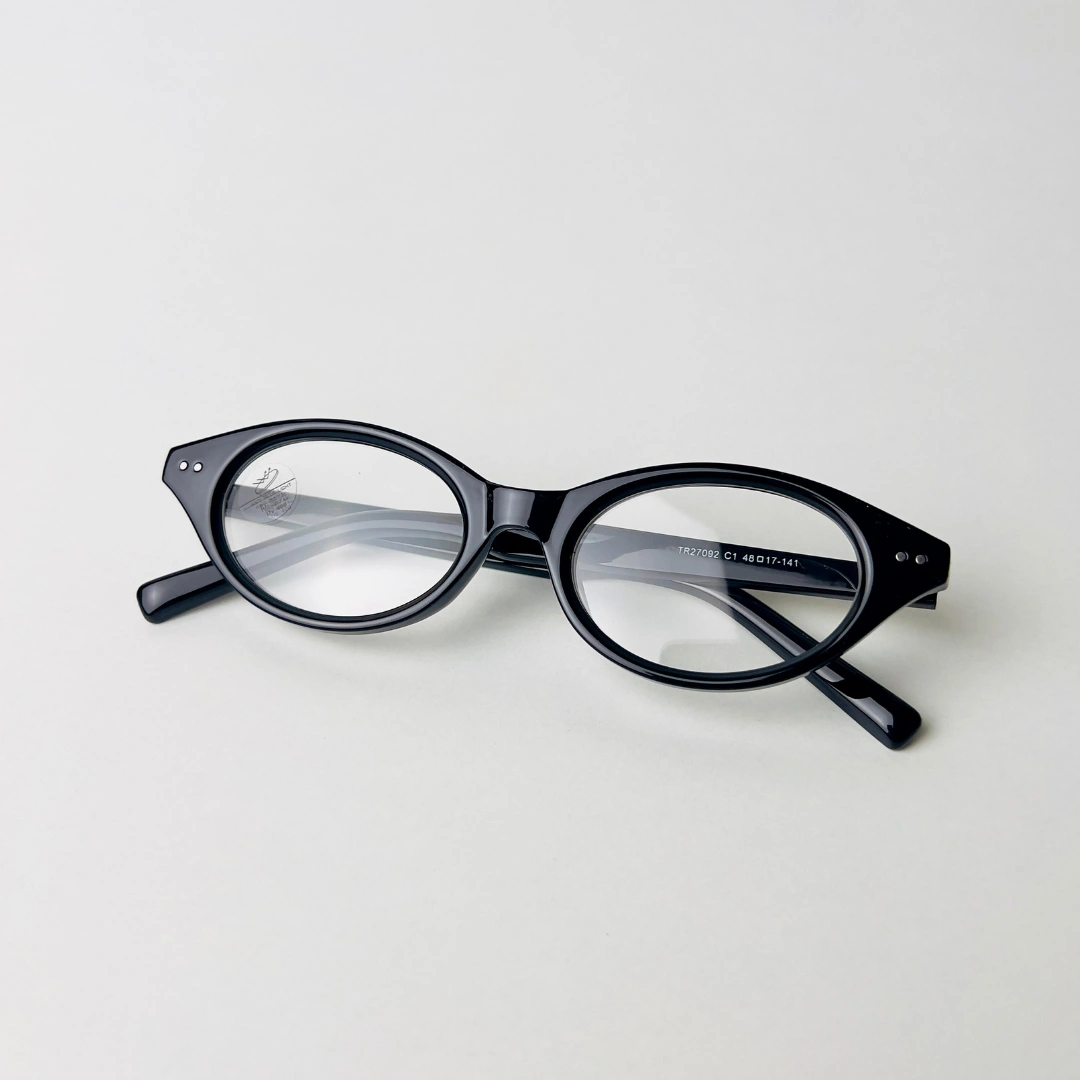 • Distinctive Shape: The frames are characterized by their oval lens shape which is subtly pulled outward and slightly upward at the outer corners. This creates a charmingly unique silhouette that is more rounded than a traditional cat-eye but equally flattering.